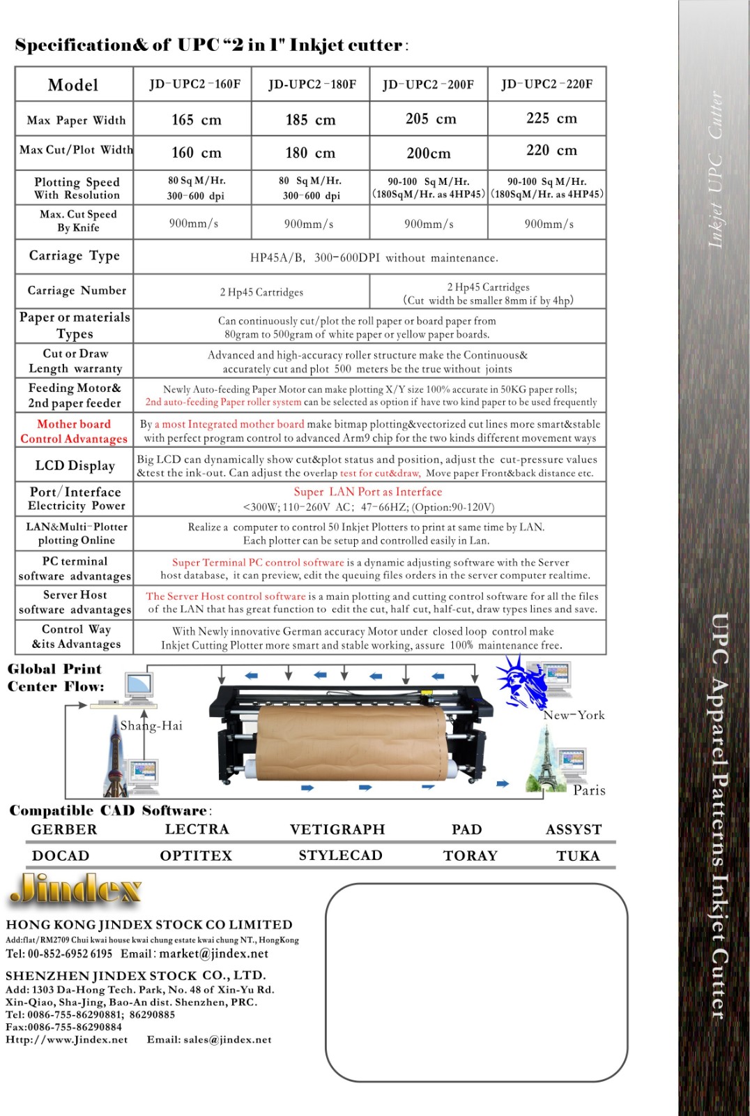 (Jindex Model Description: Due to export CE certification requirements, the model is the actual plot print size) *The worlds first front double feed system *Internet multi-machine simultaneous display/printing *Perfectly cut 300g Kraft paper *One-click online setup